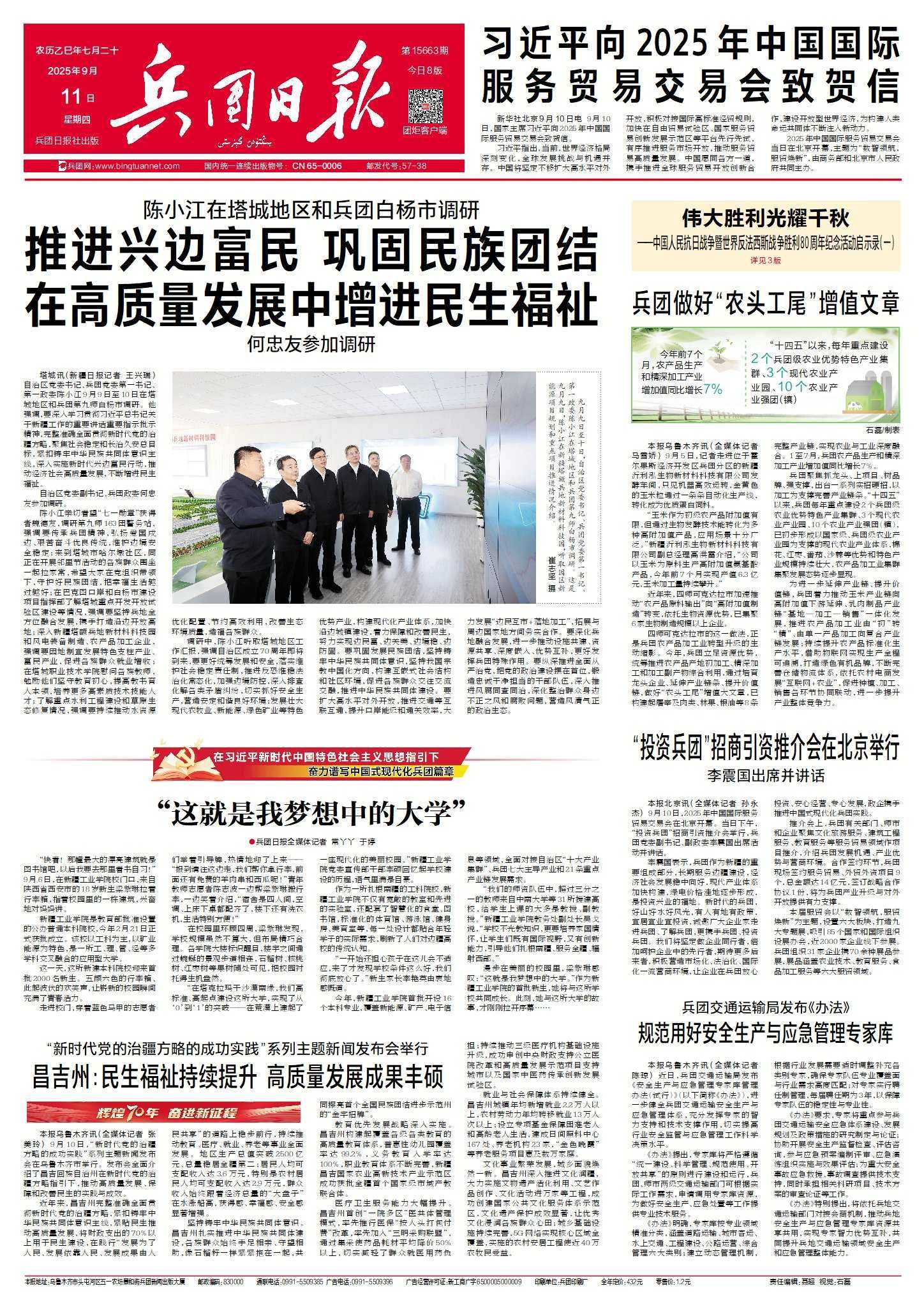 9月11日,兵团日报头版发表《“这就是我梦想中的大学”》,对beat365正版唯一官方网站2025年迎新工作及学校建设情况进行报道,全文如下: