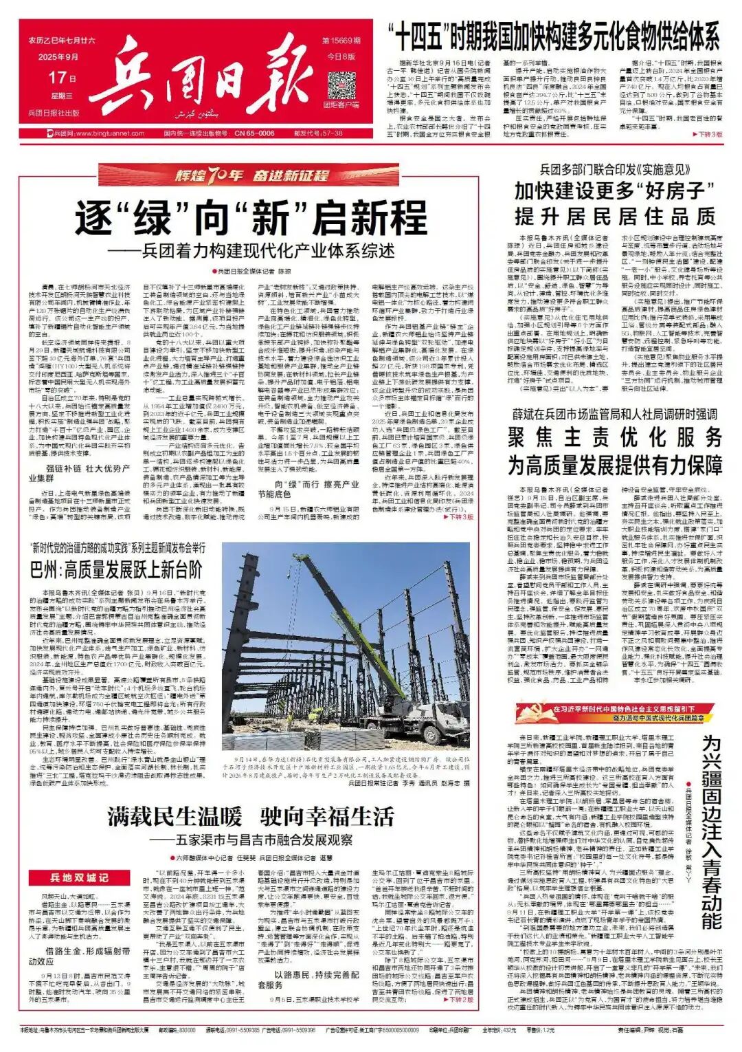 9月17日,兵团日报头版发表《为兴疆固边注入青春动能》,全文如下: