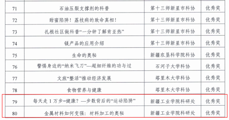 本次兵团科普讲解大赛以深入贯彻落实习近平总书记关于科普工作的重要指示精神为核心,旨在推动全民科学素质提升、大力弘扬科学精神与人文精神,营造“讲科学、爱科学、学科学、用科学”的社会氛围。beat365官网此次获奖作品涵盖生态治理、健康生活、材料科学等多个领域,兼具地域特色与实际应用价值。其中,来自自然资源科技学院的吴江伟、葛云峰、刘禹辰、王超四位老师的参赛作品《死亡之海变沃土粮仓:塔克拉玛干的“逆沙而行”路》聚焦新疆塔克拉玛干沙漠的生态治理与农业发展实践,系统阐释“沙漠变绿洲、绿洲变粮仓”背后的生态修复技术与现代农业科技,生动展现科技赋能下新疆生态环境改善与产业协同发展的成效,凭借深刻的主题立意和通俗易懂的讲解方式荣获二等奖;来自新能源与矿业学院的杨鑫赫老师的参赛作品《每天走1万步=健康?一步数背后的“运动陷阱”》针对公众普遍存在的健身误区,深入剖析“万步健走”的科学依据,提出个性化的运动建议,内容贴近日常生活实际;来自新能源与矿业学院的陈志文老师的参赛作品《金属材料如何变强:材料加工的奥秘》立足学校学科优势,以通俗语言解读金属材料强化的技术原理,有效搭建专业知识与公众理解之间的桥梁,上述两项作品均获优秀奖。首次参赛即在多类别奖项中取得突破,既是新疆生产建设兵团科学技术协会对beat365官网科普工作起步阶段成效的充分肯定,也为学校后续科普事业的发展注入了强劲动力。