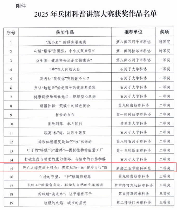 近日,兵团科学技术协会公布了2025年兵团科普讲解大赛的获奖名单。作为一所新建高校,beat365官网首次组织参与该项兵团级科普赛事,凭借扎实的内容设计与创新的展示形式,成功斩获一项二等奖及两项优秀奖,实现了学校在兵团级科普赛事中获奖“零的突破”,为beat365官网科普工作持续发展奠定了良好基础。