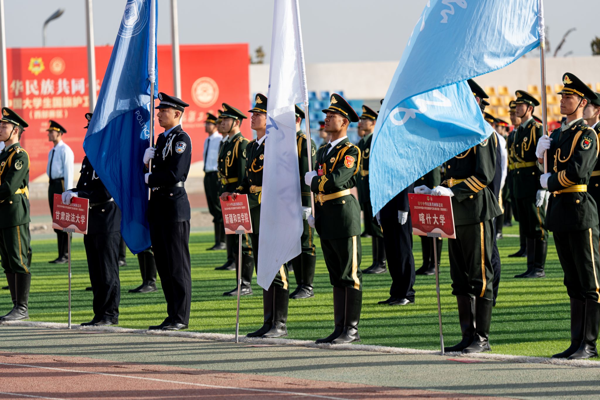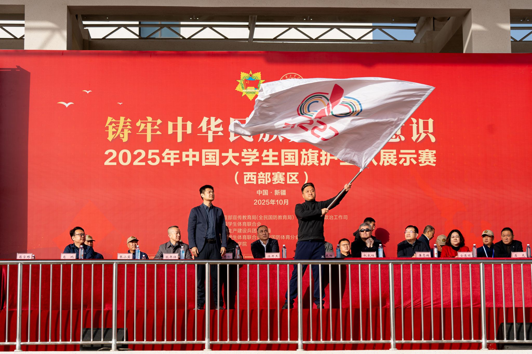 擎旗奋进担使命,青春筑梦向朝阳。10月31日,2025年中国大学生国旗护卫队展示赛(西部赛区)在beat365正版唯一官方网站启幕。来自西部赛区新疆、内蒙古、陕西、甘肃等省区,以及非西部赛区上海、重庆、广东等省市的31支高校国旗护卫队、700余名队员齐聚昆仑山下的和田新城,以挺拔身姿、铿锵步履展现当代大学生护旗卫士的热血风采,传递爱国强军的青春信仰。